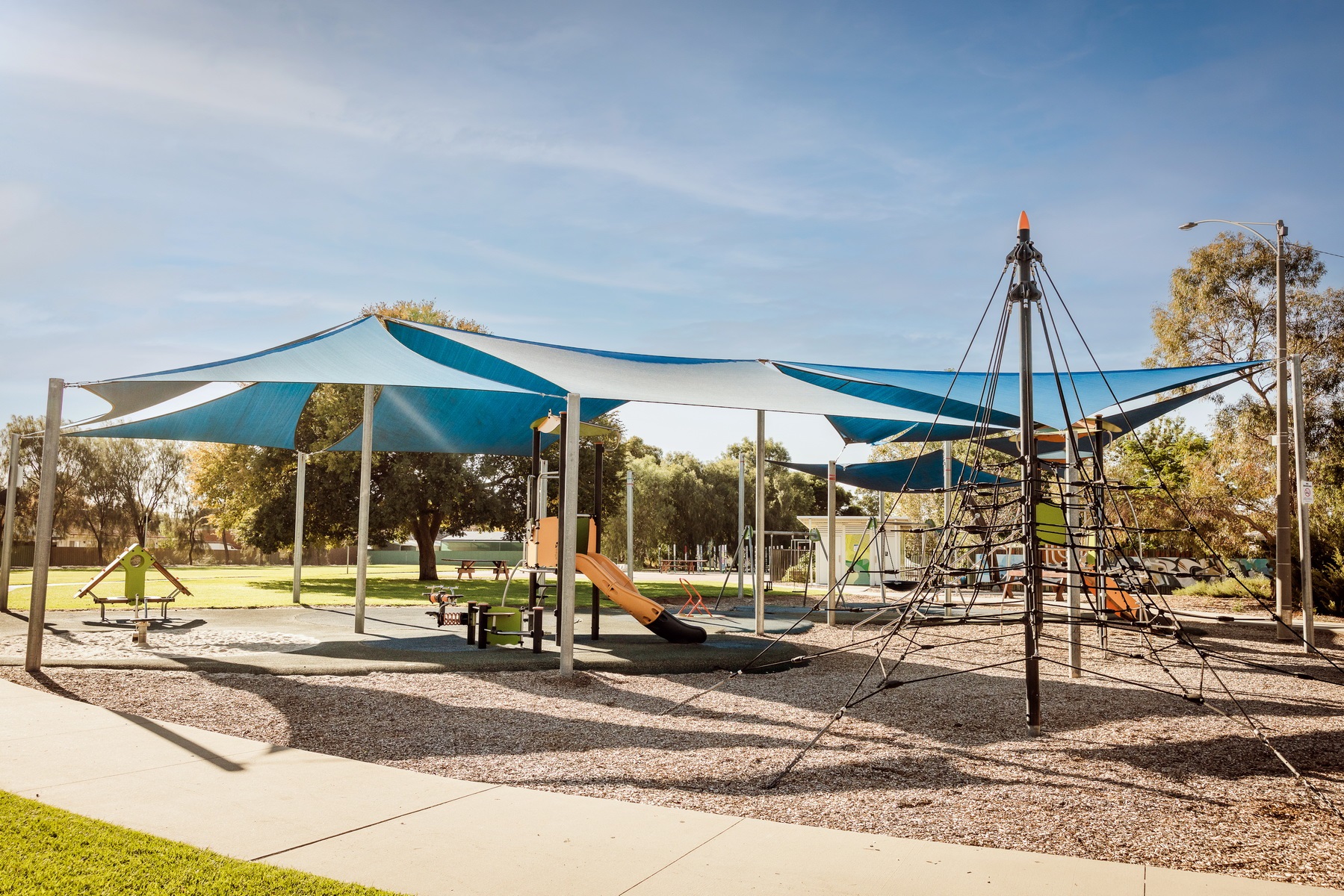 It features a well-equipped children’s playground, shaded by sails for sun protection, offering a variety of engaging play options for youngsters. The inclusive space is further enhanced by an outdoor gym area and basketball hoop, encouraging visitors of all ages to stay active and healthy.