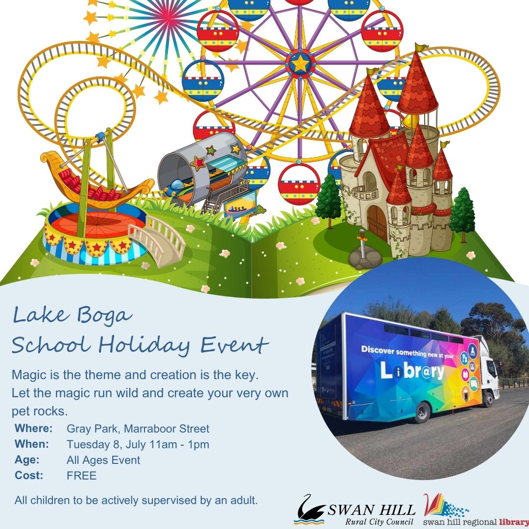 Grey Park Marraboor Street, LAKE BOGA, VIC, AustraliaLake Boga School Holiday Event at Grey Park. Magic is the theme and creation is the key. Let the magic run wild and create your very own pet rocks. All children to be actively supervised by an adult. Contact Swan Hill Regional Library for more information